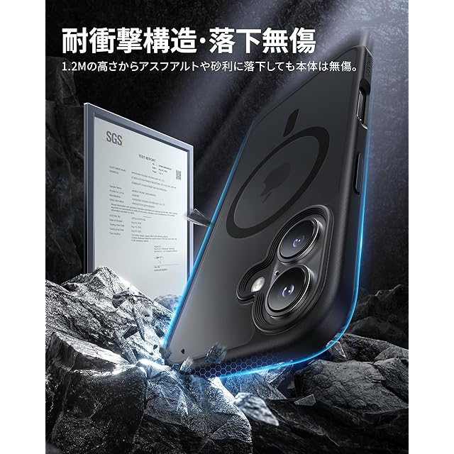 【米軍規格SGS認証・超強耐衝撃性】世界で有名な米国防総省が規定する米軍採用品規格「MIL-STD-810H」認証を取得済みです(認証番号:GZMR220802602301)。カバーの縁はスマホの液晶画面より1.4mm高く、カメラレンズより0.6mm高い、併用の保護ガラスフィルムで平置きしても画面は接触しない、細部までの保護も配慮され、より一層な安心感を与えられます。コンクリートの地面に厚さ5mmの合板を敷き、高さ1.2mから合計26回、違う角度から落下させる実験をしましたが、本体に傷はつきませんでした。高い耐衝撃性を誇り、iPhone 16 ケースを全方位からしっかりと守ります。
