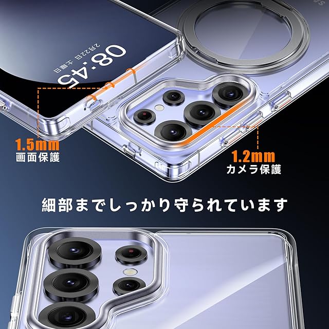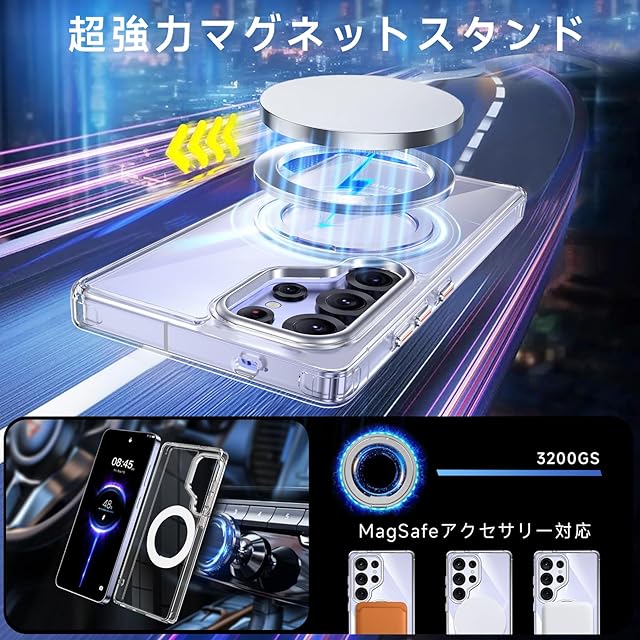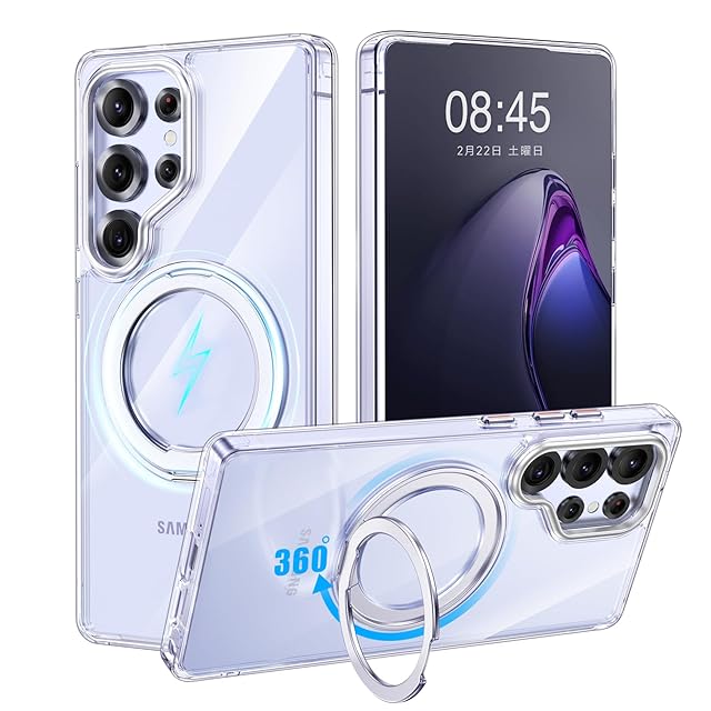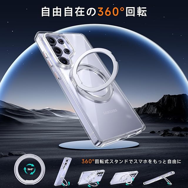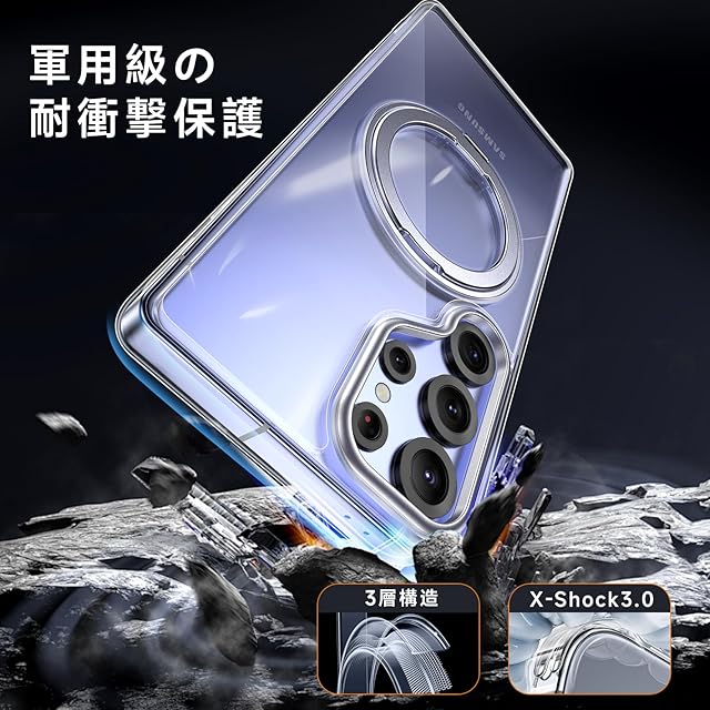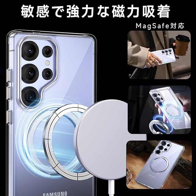 商品名:【米軍MIL規格・Magsafe対応】Galaxy S25 Ultra 用 ケース MagSafe対応 リング 360°回転スタンド機能 縦横両対応 透明 黄ばみ防止 ワイヤレス充電 レンズ保護 耐衝撃 携帯カバー ギャラクシーS25 ウルトラ カバー マグネット搭載 車載ホルダー マグセーフ対応 おしゃれ (クリア)