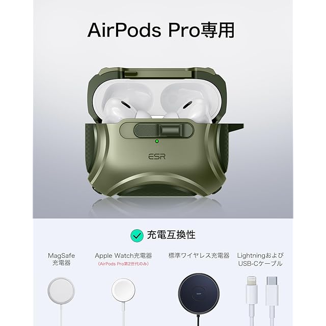 ESR AirPods Proケース(2023/2022/2019、第2/1世代)専用、AirPods Pro第2世代(USB-C/Lightningケーブル)対応、MagSafe、落下防止ロック、イージーオープン、Cyberシリーズ、暗グリーン | TREND DESIGN 家電専門店