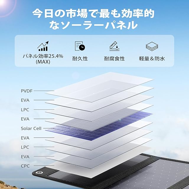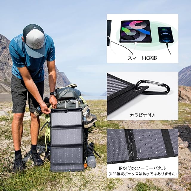✅【25.4%高い転換効率】高効率のソーラーパネルを採用し、これは業界最も耐久性の高いバッテリパネルであり、従来のソーラーパネルよりも耐久性に優れています。日が当たる所に置いておくだけでバッテリーなどを充電します。太陽光の転換効率は25.4%と高く、最大の発電効率を実現できる高効率ソーラーパネルを4枚搭載します。太陽の光がパネルに対して垂直に当たったら季節を問わず急速充電できます。