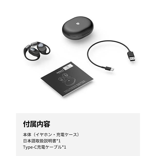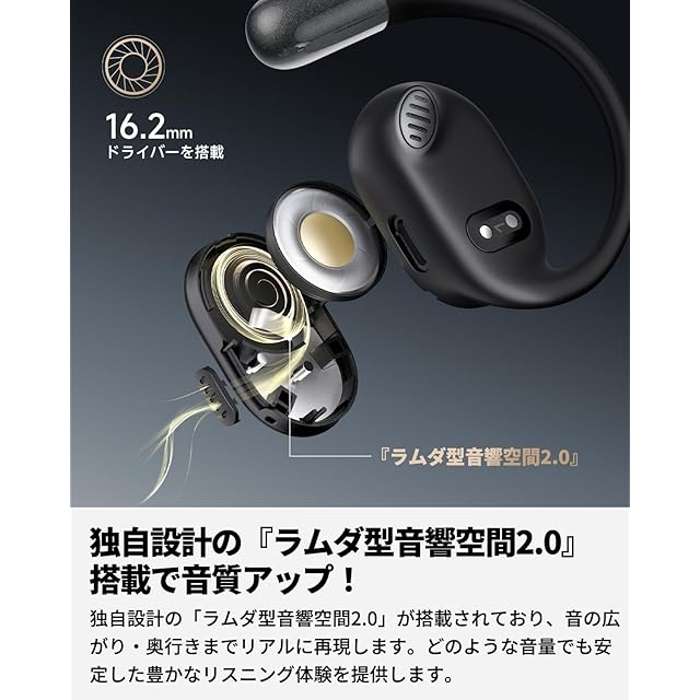 【オープンイヤー設計、究極のフィット感】 耳掛け型のオープンイヤーデザインだから耳に優しく、しかもしっかりフィット。軽快な装着感にくわえて耳への負担を軽減します。重さはわずか9g(イヤホンのみ)、羽のような軽さとコンパクトでスマートなボディは、着けているのを忘れるほど。耳を塞がないから、圧迫感がありません。長時間使用しても疲れにくく、ストレスフリーでお使いいただけます。※ご注意:初回使用時にはイヤホンの充電金属接触点のシールを剥がしてから使用してください。