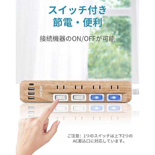 【節電】スイッチは接続機器のオン/オフができ、節電することができます。スイッチのLEDランプが青いで、通電がわかりやすくて便利です。(ご注意:1つのスイッチは上下2つのAC差込口に対応しています。個別スイッチではないです。)