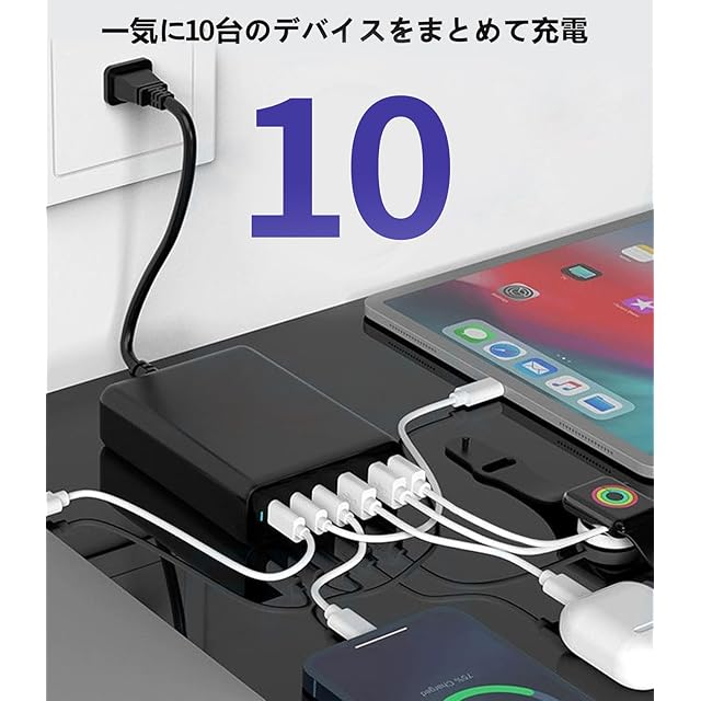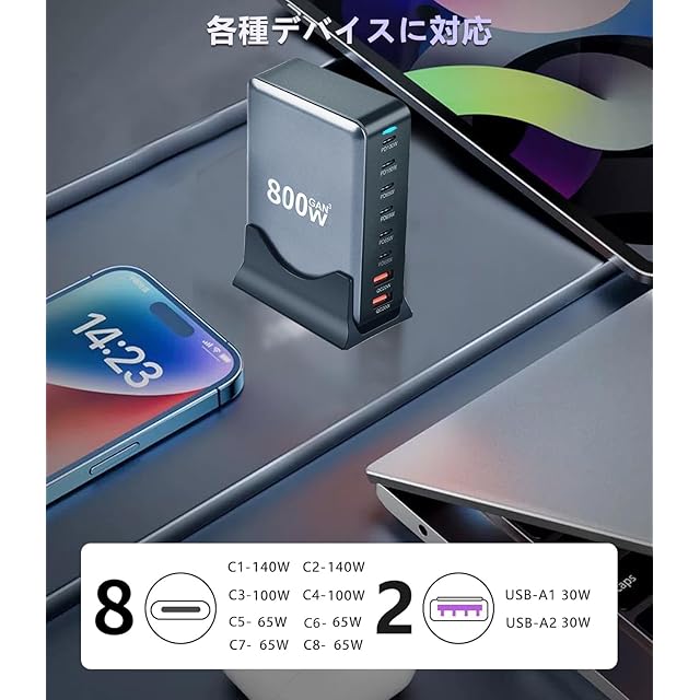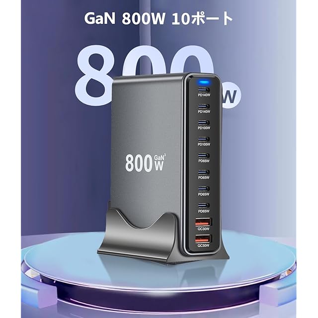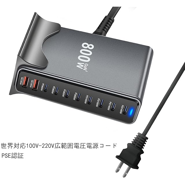800W 充電器 【 GaNFastⅢ 10ポート 2*単口140W 1.5mの電源ケーブル付き】 PD3.0対応 【PSE技術基準適合】 10ポート同時急速充電 2*140W常時対応 8USB-C&2USB-A 縦式省スペース ダブル GaNFastⅢ(窒化ガリウム) 複数ノートPCに急速充電対応 MacBook Pro PD対応 iPad/iPhone/Android/その他