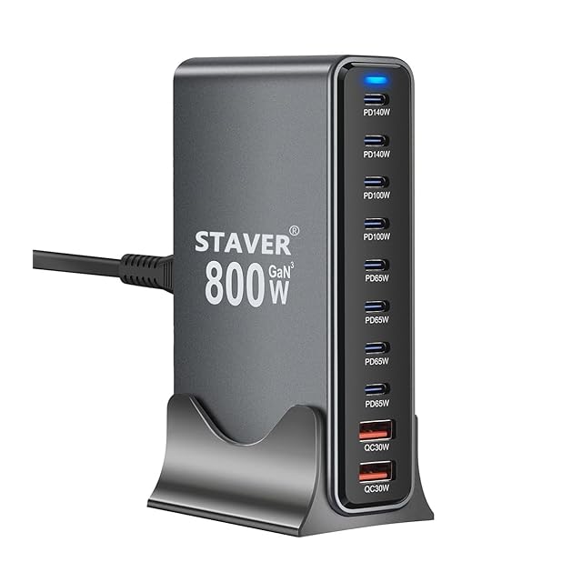 【10ポートで10台のデバイスを同時に急速充電】この充電器はUSB-Cポート×8、USB-Aポート×2の構成で、合計800Wのハイパワー出力を実現しています。10台のデバイスを同時に充電しても充電スピードが落ちることなく、真の「同時急速充電」を提供します。具体的な出力配分は、USB-C1(PD3.0 140W)+USB-C2(PD3.0 140W)+USB-C3(PD3.0 100W)+USB-C4(PD3.0 100W)USB-C5(PD3.0 65W)+USB-C6(PD3.0 65W)+USB-C7(PD3.0 65W)+USB-C8(PD3.0 65W)+USB-A1(QC 30W)+USB-A2(QC 30W)です。これにより、iPhone/Androidのスマートフォン、タブレット、Switch/Steam Deckなどのゲーム機、MacBook Proなどの高電力を必要とするノートパソコンなど、あらゆるデバイスを「同時急速充電」でサポートできます。