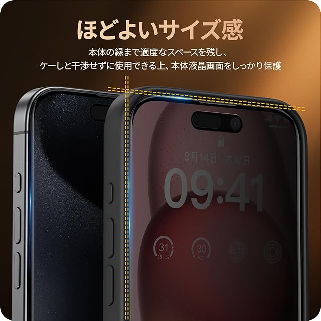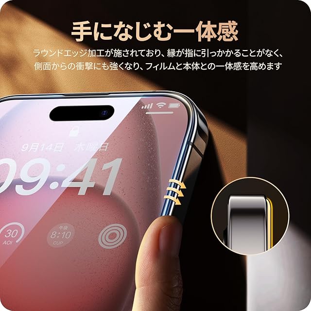 【薄型ガラス・ケースと干渉せず】厚さ0.33mmの超薄型で、透過率は99.99%。驚くほど高い透明度を誇っており、画面の鮮明さや美しさを損なわずにiPhone本来の美しい画面をお楽しみいただけます。2.5Dラウンドエッジ加工が施されており頑丈でありながら、装着後もスマートフォンのデザインを損なわず、ケースとの相性も抜群です。*本フィルムは、上部スピーカー部分に切り欠き加工がない仕様です。ご購入前にご確認ください。