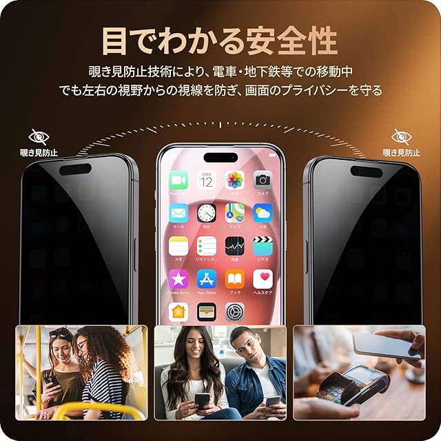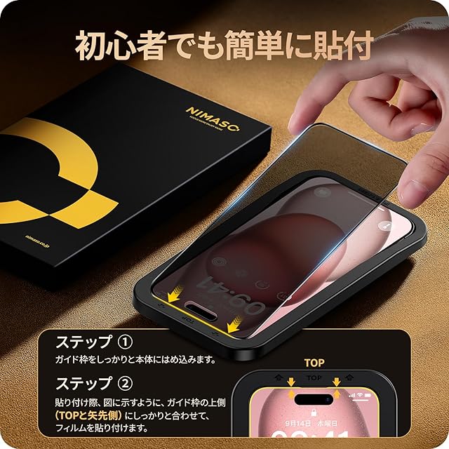 商品名:NIMASO 覗き見防止 iPhone 15 用 ガラスフィルム 全面保護 のぞき見防止 黒縁あり 強化ガラス フィルム サラサラ 高感度タッチ ガイド枠付き 2枚セット アイフォン 15(6.1インチ)対応 NSP23K906