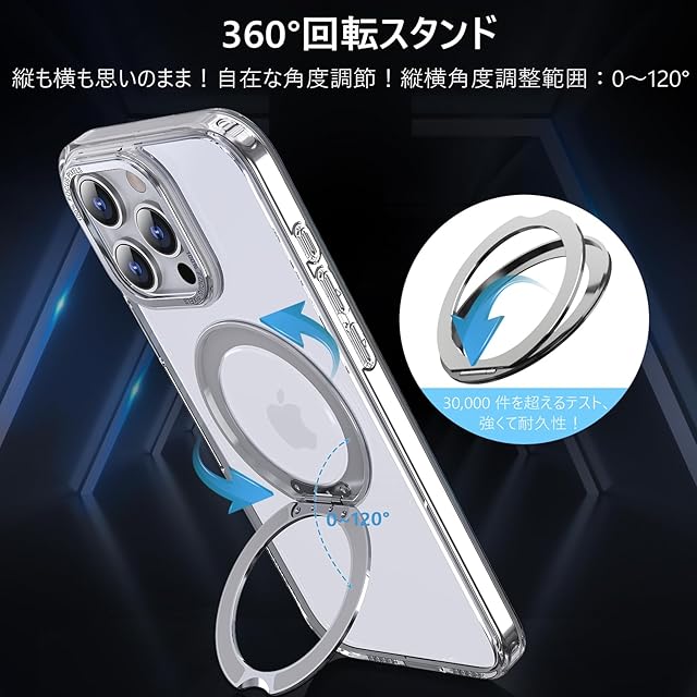 【360°回転スタンド · 縦も横も思いのまま】多機能スタンドとリング一体型の斬新なデザインです。ケースを閉じれば背面はスマートに平坦に。縦置きでも横置きでも安定して支えられ、0°~ 120°の間で多角度自由に調整できます。ケースを開けるだけでスタンドの完成!指にかければリングも便利に使用でき!また、安定したアルミ合金製の円形スタンドを採用しており、携帯性からもファッション性からも唯一無二の存在です。