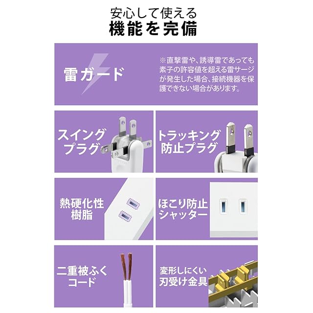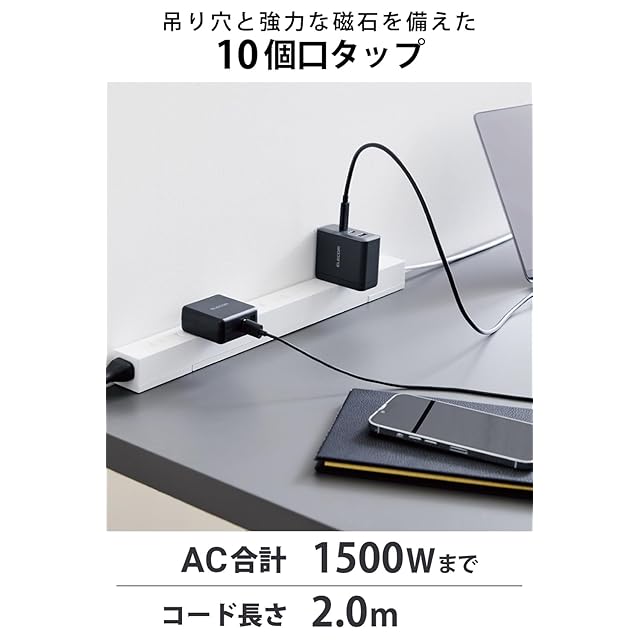 商品名:エレコム 電源タップ 10個口 2m 雷ガード ほこりシャッター 【 マグネット 回転脚パーツ 吊り穴 】 スイングプラグ ブラック ECT-2620WH
