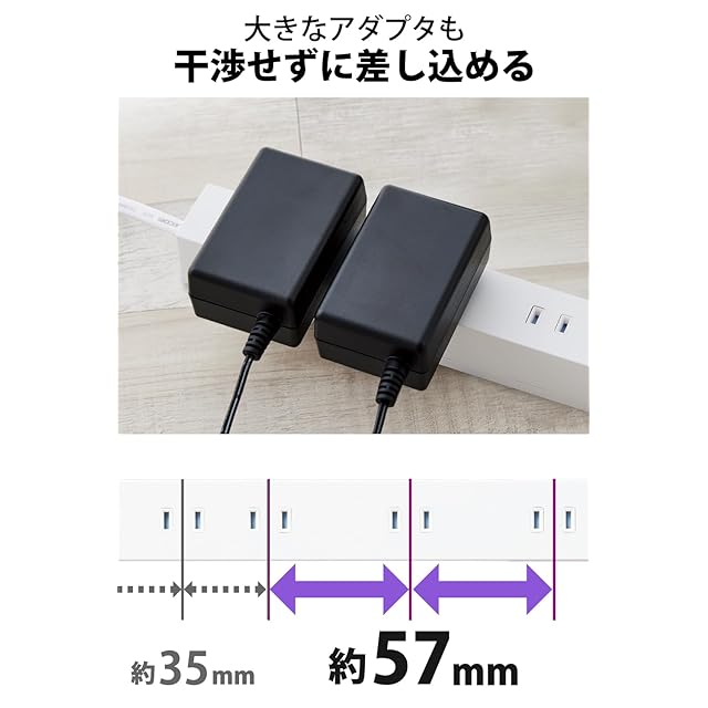 隣の差込口との間隔は57mmが2カ所、35mmが7カ所あり、プラグの形状に合わせて使用できる設計です。間隔が広い差込口には大きなACアダプターなどでも、互いに干渉せずに差し込めます。