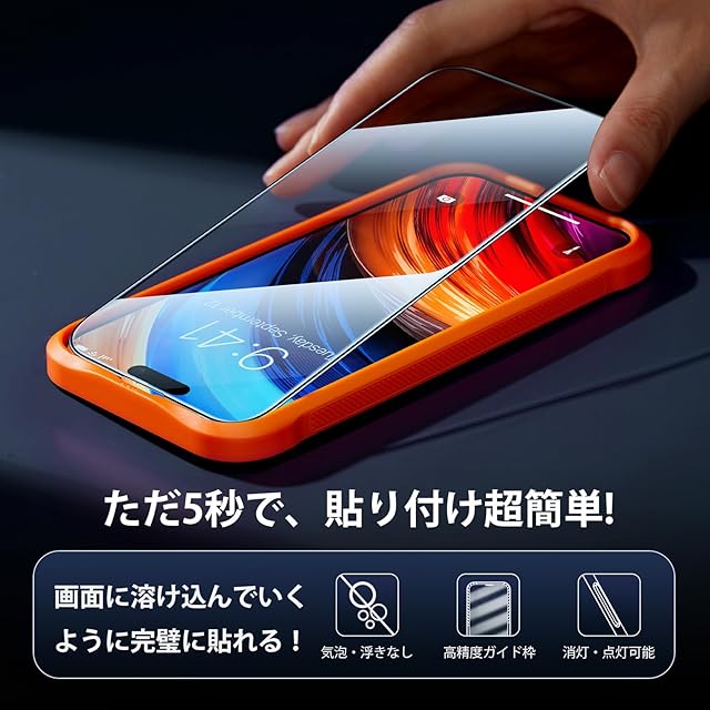 【目に優しい・貼り付けは超簡単】透過率100%で、アイフォン15ProMaxの元々の画面を臨場感たっぷりに映し出す上に、アイケア技術を磨き続け、ブルーライト、紫外線、遠赤外線、反射光、眩光、五種類を防げ、家族の目を守れる。高精度ガイド枠が付き、自己吸着層で気泡も浮きもなく、ただ5秒で画面に溶け込んでいくように完璧に貼れる。