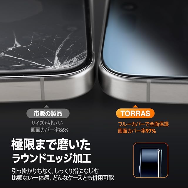 商品名:「指紋防止・指滑り超快適!」TORRAS iPhone 15 Pro Max 専用 ガラスフィルム 高精度ガイド 航空宇宙材料 米軍MIL規格 全面保護 強化極細黒縁 9H越え 2枚セット アイフォン15プロマックス用フィルム GlassGo Series