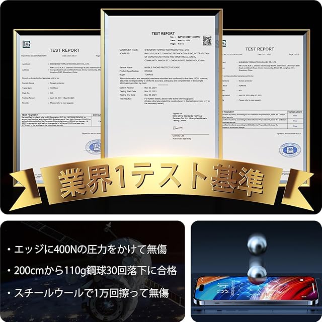 【化学強化・圧倒的な耐衝撃性】Na+/K+イオン交換技術により、表面に圧縮応力層を形成し、耐衝撃性が普通の製品より20倍も高くなる。更に、SCL緩衝層を施し、衝撃力を瞬時に分散させ、iPhone15Pro Max用ガラスフィルムの液晶画面に正面からの衝撃による割れを徹底的に防げ、本当にスクリーン保護と絶対の安心感を与える。