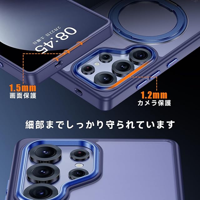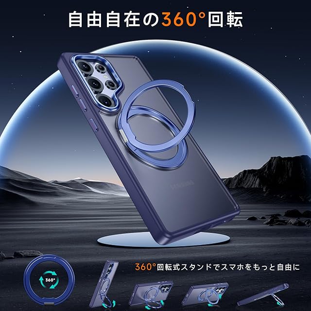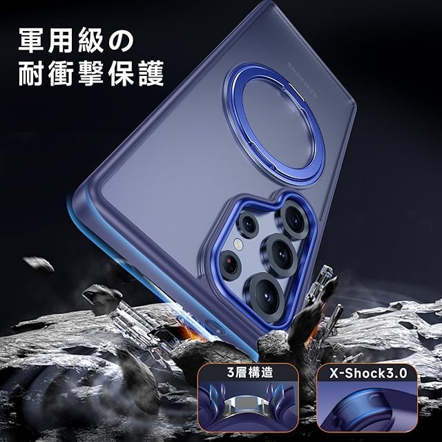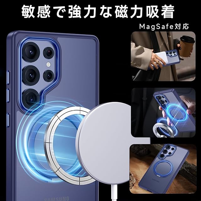 商品名:【米軍MIL規格・Magsafe対応】Galaxy S25 Ultra 用 ケース MagSafe対応 リング 360°回転スタンド機能 縦横両対応 半透明 黄ばみ防止 ワイヤレス充電 レンズ保護 耐衝撃 携帯カバー ギャラクシーS25 ウルトラ カバー マグネット搭載 車載ホルダー マグセーフ対応 おしゃれ (ブルー)