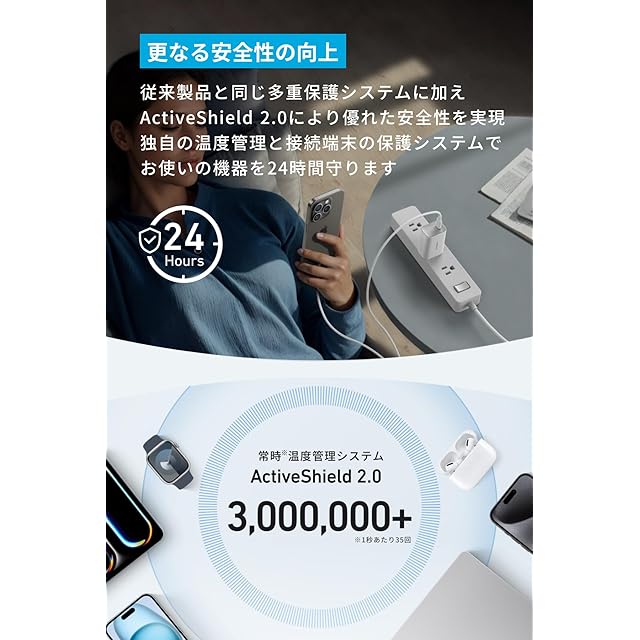 更なる安全性の向上:従来製品と同じ多重保護システムに加え、ActiveShiel 2.0により優れた安全性を実現。独自の温度管理と接続端末の保護システムでお使いの機器を24時間守ります。