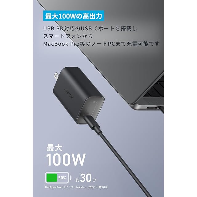商品名:Anker Nano Charger (100W) with USB-C & USB-C ケーブル 【ケーブル付属/PD対応/PSE技術基準適合/折りたたみ式プラグ】MacBook Windows PC iPhone 15シリーズ iPad Galaxy S24シリーズ Android スマートフォン ノートPC 各種 対応ブラック