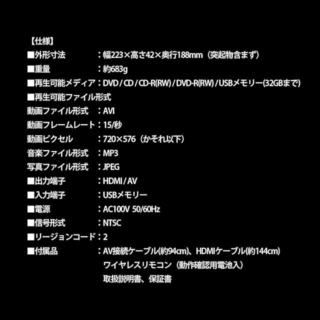 DVD/CD/CD-R(RW)DVD-R(RW)/USBメモリー(32GBまで)再生可能
