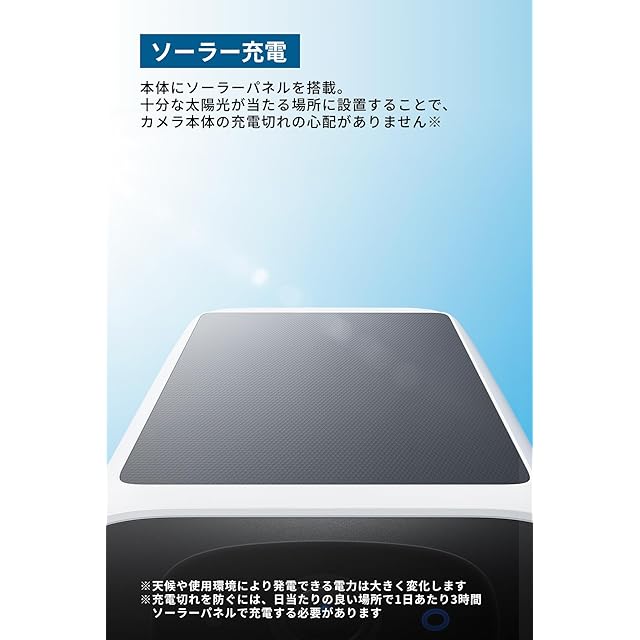 ソーラー充電:本体にソーラーパネルを搭載。十分な太陽光が当たる場所に設置することで、カメラ本体の充電切れの心配がありません。 ※天候や使用環境により発電できる電力は大きく変化します ※充電切れを防ぐには、日当たりの良い場所で1日あたり3時間ソーラーパネルで充電する必要があります