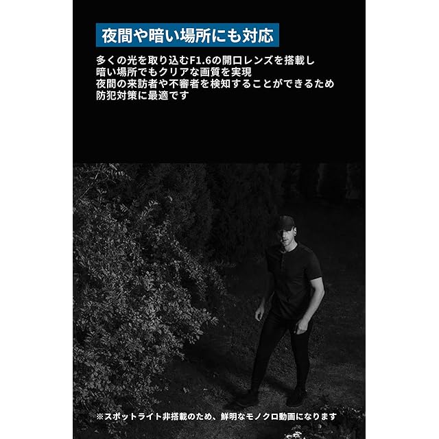 夜間や暗い場所にも対応:多くの光を取り込むF1.6の開口レンズを搭載し、暗い場所でもクリアな画質を実現。 夜間の来訪者や不審者を検知することができるため、防犯対策に最適です。 ※スポットライト非搭載のため、赤外線センサーによる鮮明なモノクロ動画になります。