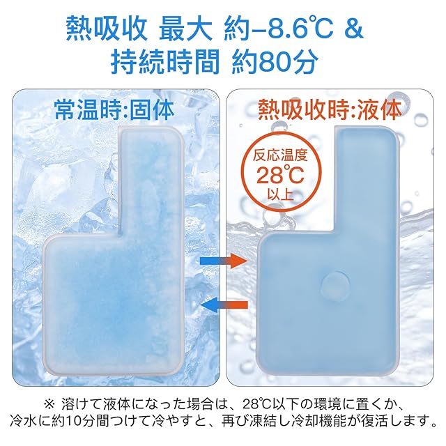 【28℃以下で自然凍結するPCM素材を採用】貼るだけで冷却。溶けて液体になった場合は、28℃以下の環境に置くか、冷水、冷蔵庫に約10分間つけて冷やすと、再び凍結し冷却機能が復活します。