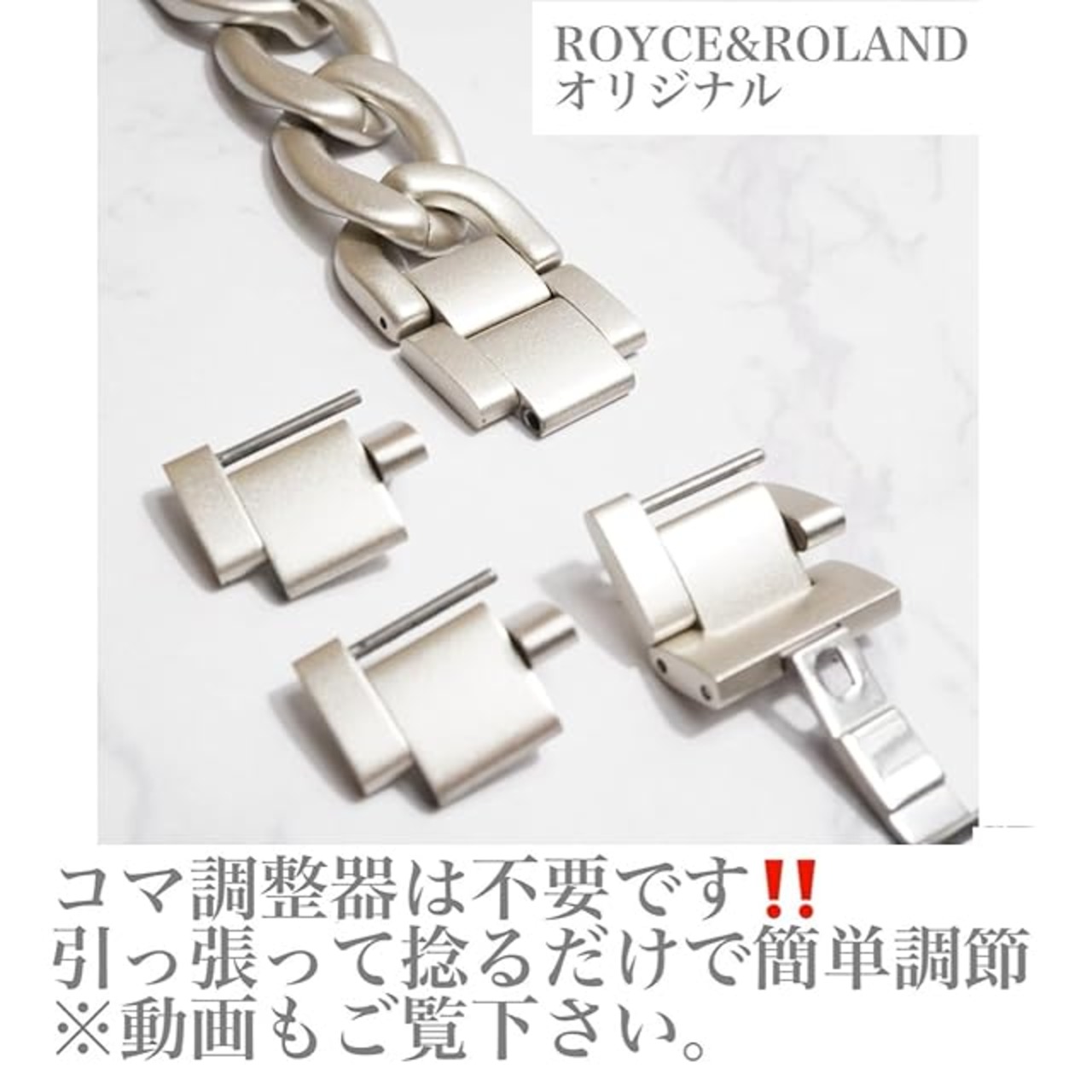 【コマ調整器が不要】コマ調整器がいらず、コマを引っ張って捻るだけで簡単に調節が出来ます。ベルトの裏面を矢印の方向へコマを引っ張り、回転させることでコマが外れます。※取り扱い説明書付き。※腕周り約14.5cmから対応します。