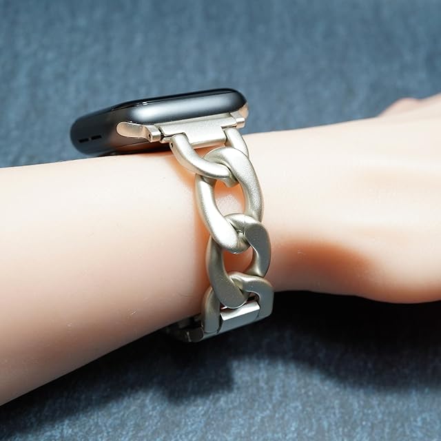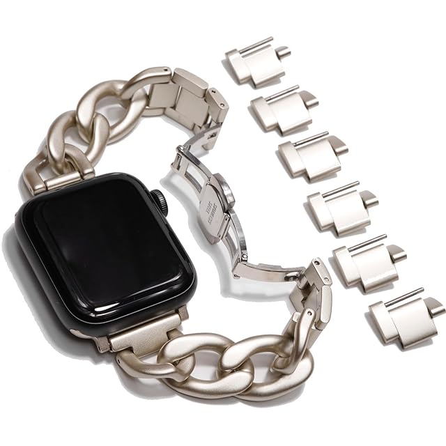【全機種対応】対応機種:Apple Watch Series 10 , 9 , 8 , 7 , 6 , 5 , 4 , SE ,Ultra 2.1 /サイズ:40 . 41 . 42 . 44 . 45 . 46 . 49mm対応 / ご希望のサイズをお選びください。 / 付属品:輸送用ボックス、コマ調整説明書 ※アップルウォッチ本体は付属しません。※ゴールドカラー、ピンクゴールドカラーはチェーンが重なり合う部位は塗装が薄れシルバーに近い色味となりますが、不良品ではございません。装着時には露出しない部位となります。【高級感溢れるバンドで華やかに】チェーンベルトがキラキラ輝くデザインで、一段と上品な雰囲気を演出します。手首につけるだけでオシャレ度がグッと上がり、着けていても違和感のない重さなので、ビジネスからカジュアルな場面まで幅広いシーンでお使いいただけます。【装着も楽々】高級時計にも用いられるバタフライバックルを採用。ベルト側面のボタンを押すだけで片手でもスマートに開閉でき、スピーディーに着脱できるので忙しい朝でもサッと着用可能です。使い勝手抜群なので、爪が柔らかい方やジェルネイルも傷つける心配がありません。【ステンレススチールを採用】合金ではなくステンレススチールを用いたチェーンブレスレット。ステンレススチールの磨き上げられた美しいデザインが特徴で、チェーンはポリッシュ加工、コマは高品質サテンで仕上げています。リング状のチェーンは通気性も抜群です。【コマ調整器が不要】コマ調整器がいらず、コマを引っ張って捻るだけで簡単に調節が出来ます。ベルトの裏面を矢印の方向へコマを引っ張り、回転させることでコマが外れます。※取り扱い説明書付き【必ずお読みください】 1.ステンレスは金属アレルギーを起こしにくい素材ですが、体質によって、かゆみ・かぶれを生じる場合がありますので、皮膚に異常を感じたときは、ご使用をお止めいただき専門医にご相談ください。金属アレルギーが心配な方は、皮膚科にてパッチテストなどのアレルギーテストを受けられることをおすすめします。?ご購入後のアレルギー反応に関しまして責任は一切お受け出来かねます。あらかじめ、ご了承ください。金属アレルギーの方はご使用しないで下さい。 2.力仕事や激しいスポーツをする時、就寝時や幼児の世話をする時など、身体に危害を及ぼす場合がありますのでジュエリーをはずしてください。 3.サウナ等高温の場所、あるいはスキー場等極寒地でのピアスなどのジュエリーの使用は、火傷、凍傷の原因となる場合がありますので、着用しないでください。