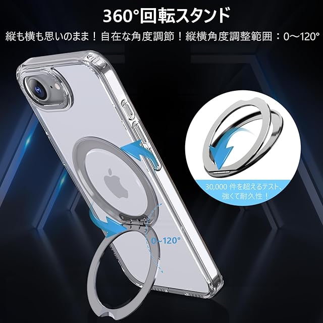 【360°回転スタンド · 縦も横も思いのまま】多機能スタンドとリング一体型の斬新なデザインです。ケースを閉じれば背面はスマートに平坦に。縦置きでも横置きでも安定して支えられ、0°~ 120°の間で多角度自由に調整できます。ケースを開けるだけでスタンドの完成!指にかければリングも便利に使用でき!また、安定したアルミ合金製の円形スタンドを採用しており、携帯性からもファッション性からも唯一無二の存在です。