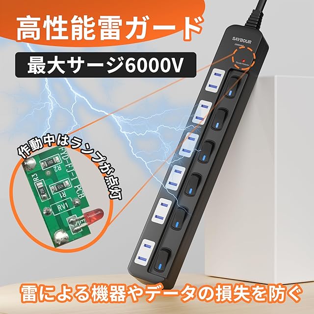 商品名:SAYBOUR 電源タップ 雷ガード 個別スイッチ 節電タップ おしゃれ省エネ ACコンセント 6個口LED PSE認証済 延長コード (2m, ブラック)