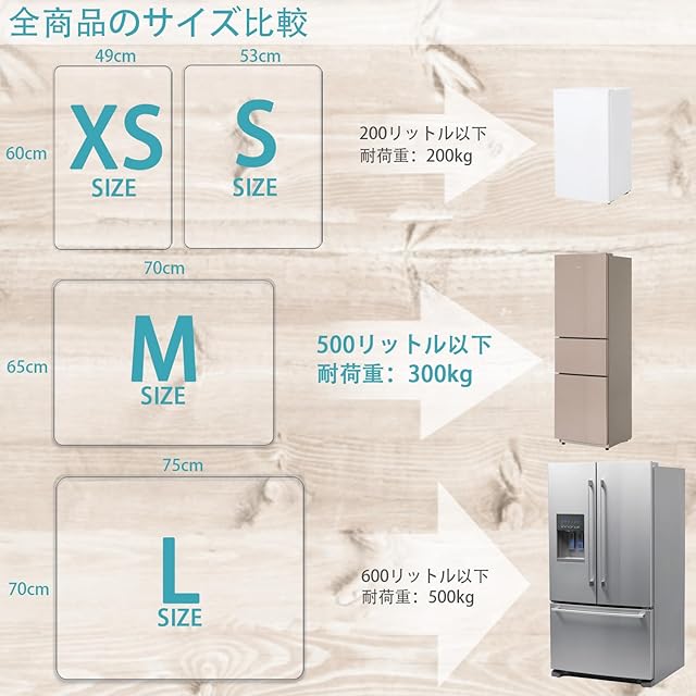 キズ/凹みを防止:ソフトの素材なので、床に受けた圧力が大幅に激減する。冷蔵庫を置く際に緩衝材のように床やフローリングから傷や凹みからきちんと守ります!三サイズを選択可能、Sサイズ(53*62cm)、耐荷重:200kg、200Lクラスの冷蔵庫適用;Mサイズ(65*70CM)、耐荷重:300kg、500Lクラスの冷蔵庫適用;Lサイズ(70*75CM)、耐荷重:500kg、600Lクラスの冷蔵庫適用。