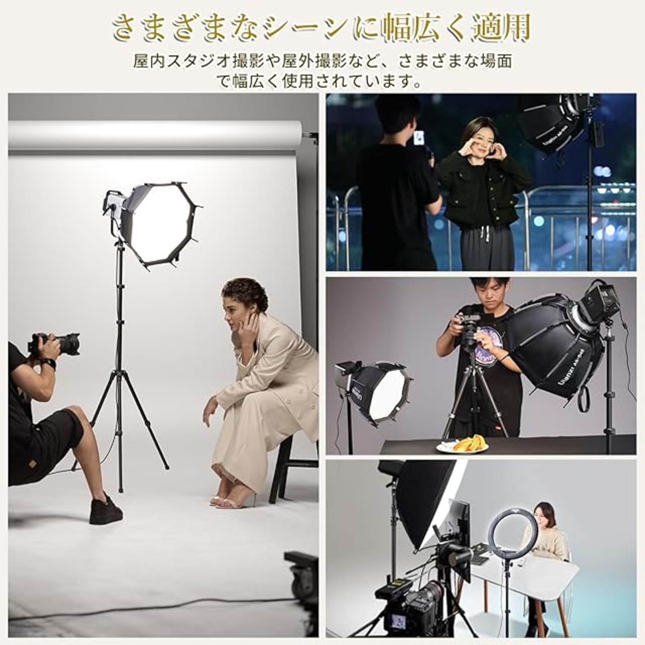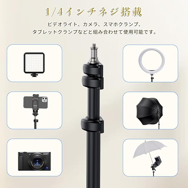 【汎用性のある互換性】照明スタンドの先端に1/4ネジが搭載られて、ソフトボックス、傘、反射鏡、リングフラッシュライト、LEDライト、雲台、デジタルカメラなどに適用。YouTube生放送、写真撮リ、ビデオ撮影などにご利用いただけます。