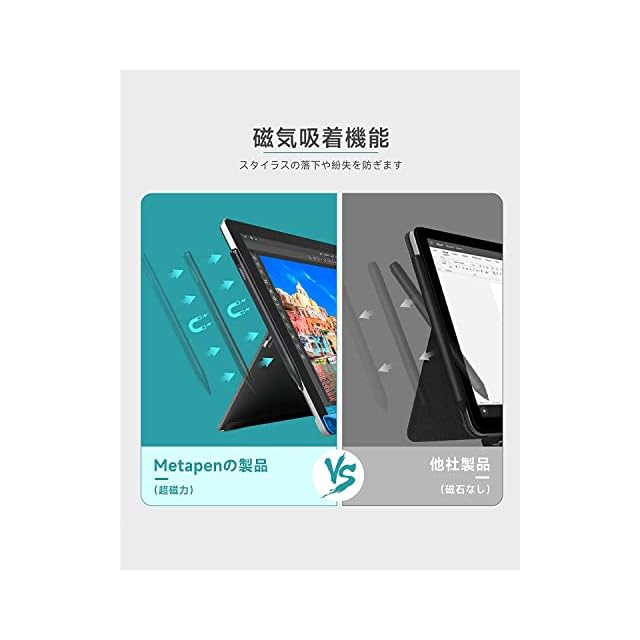 ・公式認定&右クリック&消しゴム&磁気吸着機能・2022最新進化版Metapen M1は、Microsoftの公式認定を取得し、MPP1.51技術を搭載しています。Bluetooth接続は不要で、すぐに動作し、自動的にスタイラスを有効なコマンドとして認識します。ボタン上部は便利な右クリック機能、ボタン下部は消しゴム機能を搭載しています。磁気吸着で、収納や持ち運びに便利です。磁気吸着機能対応デバイス:Surface Pro 3~Pro 7、Surface Book/Book 2/Book3、Surface 3、Surface Go/Go 2/Go 3、Surface Studio、Surface Studio 2。磁気吸着機能非対応 : Surface Pro 8~X、Surface Duo/Duo 2、Laptop 1/2/3/4/Laptop Studio。