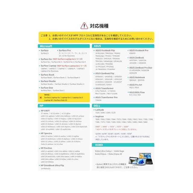 ・MPP規格に対応&幅広い互換性・Windows Ink向けに設計されており、MPP規格に対応したマイクロソフトコンピュータ用:Surface Pro 9、Surface Pro X、 Surface Pro 8、Surface Pro 7+、 Surface Pro 7、 Surface Pro 6、Surface Pro 5、Surface Pro 4、Surface Pro 3、 Surface Go/Go 2/Go 3、Surface Laptop/Laptop 2/Laptop 3/Laptop 4/Laptop 5/Laptop Studio/Laptop Studio 2+、Surface Book/Book 2/Book 3、Surface 3、Surface Studio/Studio 2(より互換性のあるHP、ASUS、DELLモデルについては、お問い合わせください。)