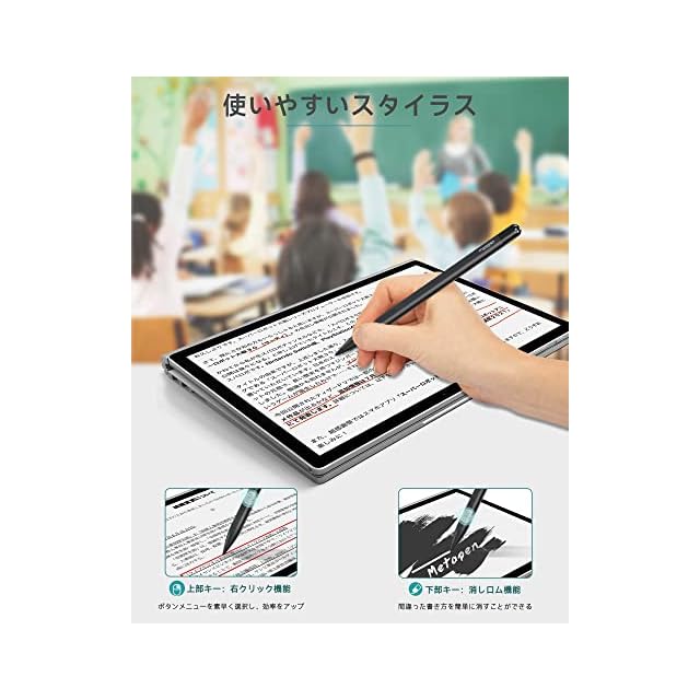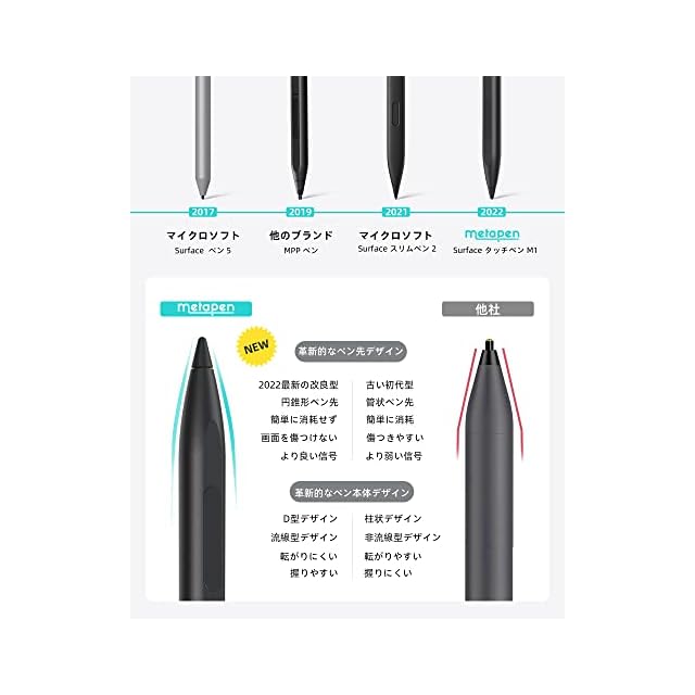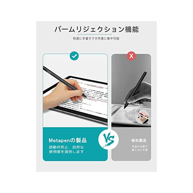 ・革新的なペン本体とペン先設計&パームリジェクション機能・Metapen M1の合理化された一体型設計は人間工学的であり、テーブル上で簡単に転がりません。市場に販売されている他の管状ペン先(古い初代型)に比べ、Metapenの最新の改良型円錐形ペン先は簡単に消耗せず、画面を傷つけず、信号が良く、長持ちし、疲れを感じさせない、問題なくメモや文章を取ることができます。最先端のパームリジェクション機能を搭載、自由にデバイスの画面に置くことができて、手元の作業に集中できます、自然で快適な使い心地です。このsurface ペンは、Microsoftタッチスクリーンデバイスの完璧なコンパニオンです。