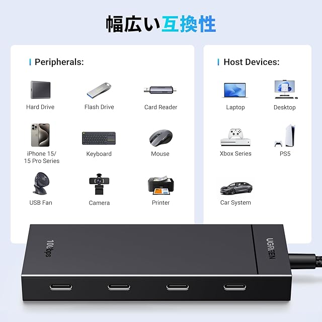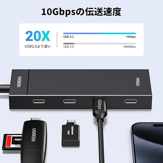 商品名:UGREEN USB-C ハブ 4ポート4xUSB-C USB3.2 Gen2 10Gbps高速データ転送 軽量 変換アダプター 4-in-1 Type-C 拡張ハブ 増設 MacBook Pro/Air 、 iMac、iPad Pro/iPad Air 、iPhone 15/15 Pro、 Galaxy S23/ S24などに対応