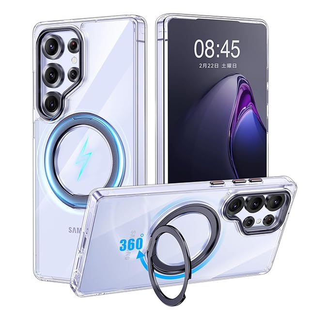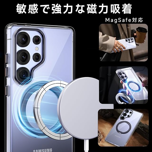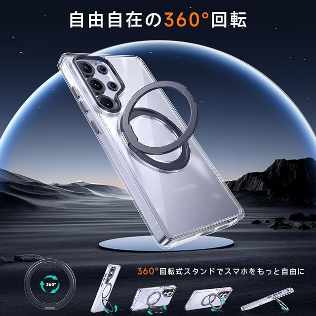 商品名:【米軍MIL規格・Magsafe対応】Galaxy S25 Ultra 用 ケース MagSafe対応 リング 360°回転スタンド機能 縦横両対応 透明 黄ばみ防止 ワイヤレス充電 レンズ保護 耐衝撃 携帯カバー ギャラクシーS25 ウルトラ カバー マグネット搭載 車載ホルダー マグセーフ対応 おしゃれ (クリアブラック)