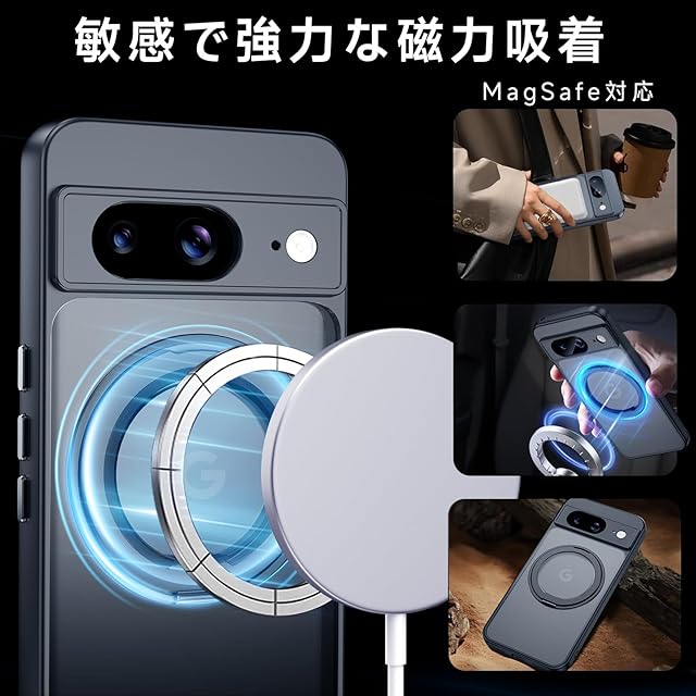 商品名:【米軍MIL規格・Magsafe対応】Google Pixel 8 用 ケース MagSafe対応 リング360°回転スタンド機能 縦横両対応 半透明 黄ばみ防止 ワイヤレス充電 ピクセル8 スマホケース レンズ保護 耐衝撃 携帯カバー グーグルピクセル8 カバー 6.2 インチ マグネット搭載 車載ホルダー マグセーフ対応 おしゃれ (ブラック)