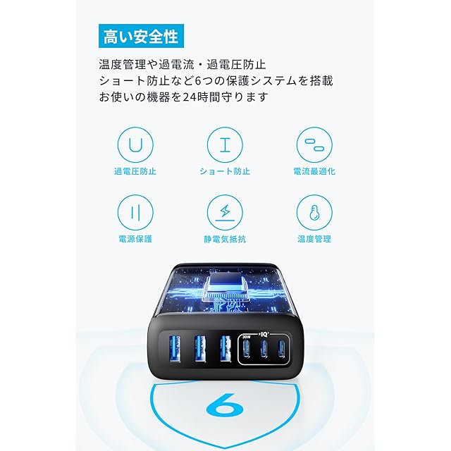 6台の機器を同時充電:USB-Aポート3つ、USB-Cポート3つを搭載MacBook Air、iPhone、iPadなど最大6台の機器への同時充電が可能です。