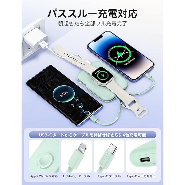 【2本ケーブル内蔵 & 4台同時充電可能】Type-CとiPhone用ケーブルが内蔵されており、USB-Cポートとapple watch 充電器を合わせて最大4台の機器を同時に充電することができ、パワーのある究極のモバイルバッテリーです。iPhone/Android/ゲーム機などデバイスに対応し、幅広い機種に対応できます。また、Type-C端子からモバイルバッテリー本体に蓄電できますし、パススルーにも対応しておりますので、モバイルバッテリーを充電しながらApple Watchなども充電できます。夜にセットして、朝起きたら全部フル充電完了です。