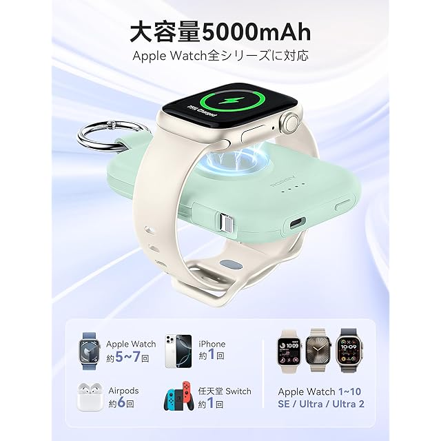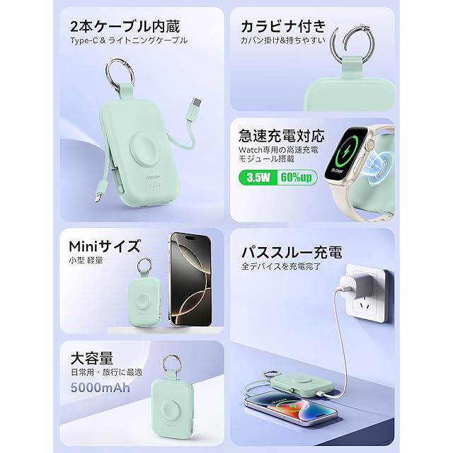 商品名:【新色登場】RORRY apple watch 充電器 モバイルバッテリー 5000mAh 2本ケーブル内蔵 【iPhone用+Type-Cケーブル】 アップルウォッチ対応 ワイヤレス充電 同時充電 最大4台同時充電 For Apple Watch ultra2/9/8/7全シリーズに対応 軽量 小型 コンパクト 持ち運び/PSE認証済 for iPhone 15/14/Android グリーン
