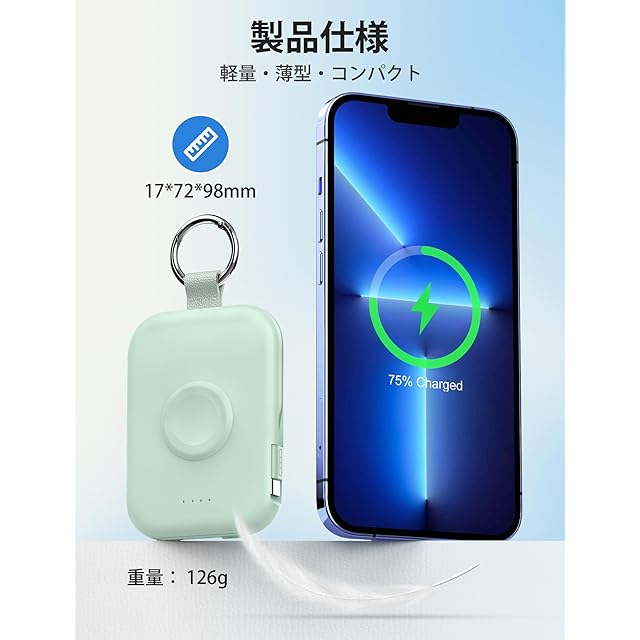 【5000mAhバッテリー/磁気充電】5000mAh容量バッテリーが内蔵され、Apple Watchを7回フル充電することができます。iphone14を約1回、一日中の充電対策としては十分です。そして、Apple Watch充電器はコンセントやケーブルがなくてもくっつけるだけで充電できます。磁気ワイヤレス充電モードなので、置くだけで、しっかりと吸着させ、いつでもどこでも充電することが可能になります。また、133gという軽さ、コンパクトさと汎用性のバランスが取れている一品です。