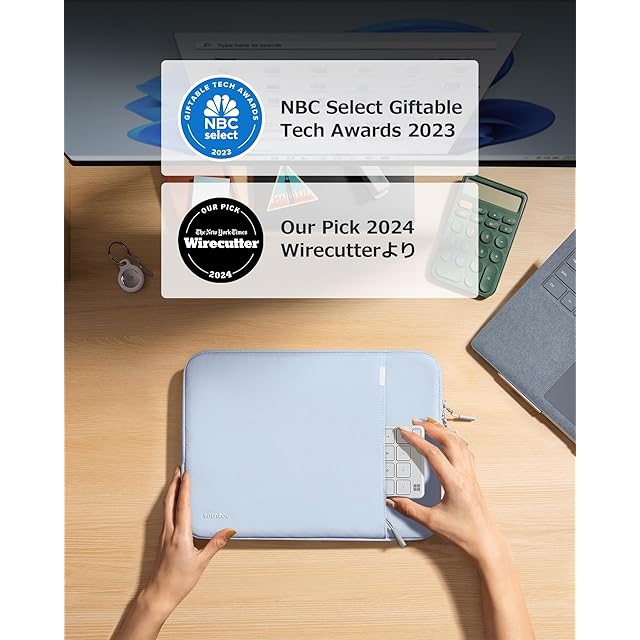 【メディアやお客様からの評判】想像以上の保護力や優れた品質、ピッタリフィットな装着感で、このPCケースは広く高評価されています。Wirecutterより「一番人気のノートパソコンスリーブ ・MacBook Proケース」と褒賞され、さらにNBC Selectより「Select Giftable Tech Awards 2023」を授賞されました。注:Wirecutter :「The New York Times」所属ガジェットレビューメディア。