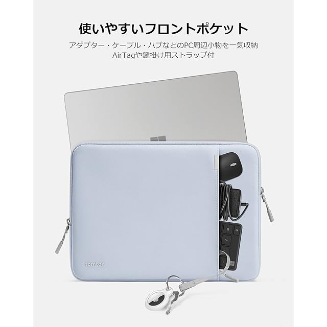 【便利なフロントポケット】フロントポケットはKindle、アダプター、ケーブル、マウス、ハブ、USBメモリ、イヤホンなどのPC周辺小物を一気に収納できます。AirTagや鍵掛け用ストラップ付。この軽量でコンパクトなラップトップ保護ケースは他のショルダーバッグ、バックパックに簡単に収納できます。