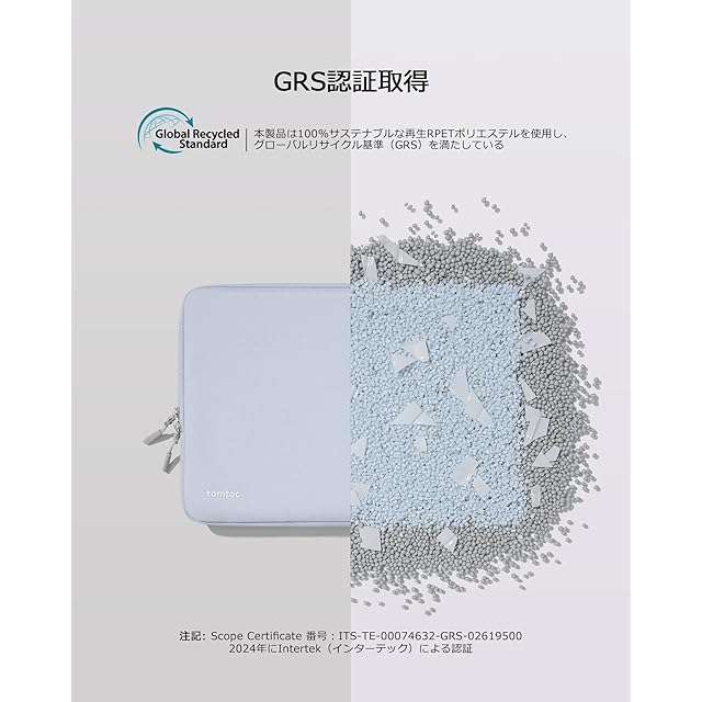 【サステナビリティと品質の融合】 GRS認証(グローバル・リサイクル・スタンダード)を取得したこのノートパソコンケースは、環境に優しい素材と優れたクラフトマンシップを兼ね備えています。撥水加工されたリサイクル生地を使用し、安心のYKKジッパーと柔らかな裏生地が特徴です。何百万本もの廃棄されたプラスチックボトルを再利用して、耐久性と高い機能性を実現したデザインです。tomtoc製品は全て12ヶ月間安心付きます。