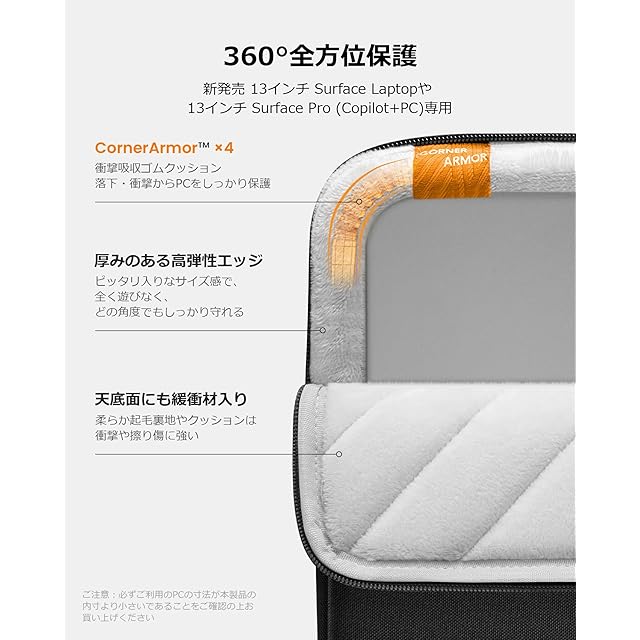tomtoc Defenderシリーズ 360度保護パソコンケース</br> 【軍用レベルのCornerArmor保護】</br> ケース全ての4隅に、新世代の特許取得の「CornerArmor」ガードが装備され、軍用レベルの落下テストをクリアした超強耐衝撃力でエアバッグのようにご貴重なノートPCを落下・衝撃などぶつかることから全方面丸ごと守ります。(落下テスト規格:MIL-STD-810H:2019)</br> 【360° 全面保護】</br> 内部は厚くふわふわとしたフランネル起毛生地の採用に加え、tomtocパソコンケースの統一なデザインとして、中はラインが並んでいる模様に設計され、洗練されて整然とした見た目でながら耐衝撃にも役立ちます。ジッパー周りの厚手高弾性エッジにより、ノートPCがジッパーに当てて、傷付くことを防げます。</br> 【品質や環境保護への取組み】</br> 安心のYKK製両開きファスナーを使用し、耐用性に優れて、開閉もよりスムーズで使いやすいです。表地は撥水加工された、PETボトルなどのプラスチックをリサイクルしてから作ったエコ素材を採用。プラスチックの再生利用により環境汚染の減少に取り組んでおります。tomtoc製品は12ヶ月間安心付きます。</br> 【便利な小物ポケット】</br> フロントポケットはKindle、アダプター、ケーブル、バウス、ハブ、USBメモリ、イヤホンなどのPC周辺小物を一気に収納できます。AirTagや鍵掛け用ストラップ付。</br> 【ピッタリフィット】内寸:305×215×22mm。13インチ Surface Laptop 2025 / 12.3-13インチ Surface Laptop Copilot+PC 2025 / Surface Pro 11 Copilot+ PC/10/9/8/X/7+/7/6/5 / 12.4 Surface Laptop Goにピッタリ対応。Surface ProにSurface Pro Flex/タイプカバー/Signature キーボード/Surface Pro X キーボードを装着したまま入ります。