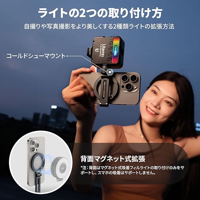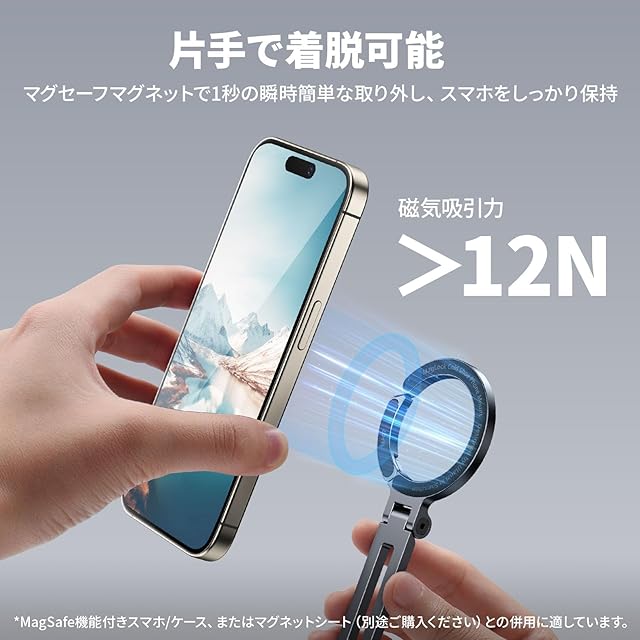 【1秒で簡単に着脱】12N超強力磁力でピタッと取り付けられるので、iphone16/15/14/13/12を近づけるだけで、ピタッと吸着します。マグセーフに対応しているため、iphoneをホルダーでで挟んだり、ネジで固定するの必要はなく、片手でわずか1秒で簡単に着脱が可能。また、背面もマグネット式拡張でき、フィルライトの取り付けのみをサポートします。*注:スマホの吸着はサポートしません。