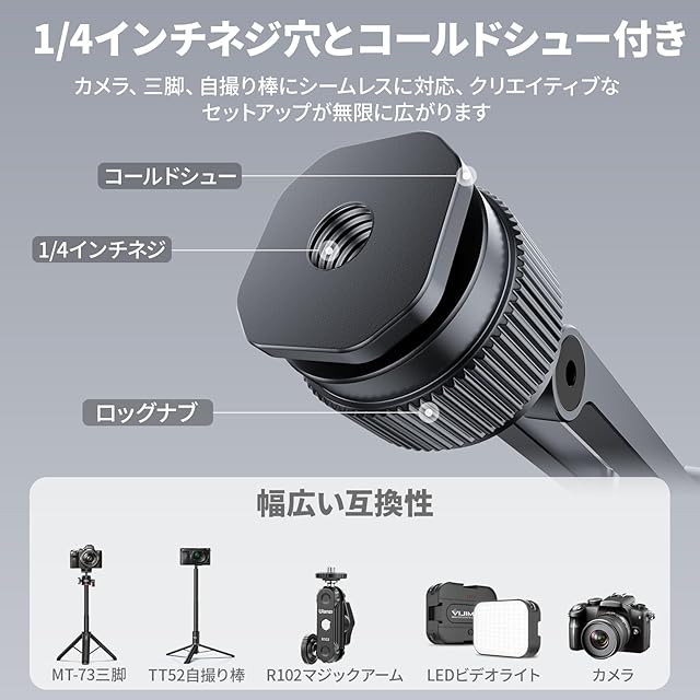 【コールドシューと1/4ネジ穴付き】スマホホルダーは1/4ネジ穴とコールドシューを装備しております。三脚や雲台、自撮り棒などに撮影できます。コールドシューがあるので、カメラホットシューに直接取付できます。ライブ配信や動画撮影・集合写真・子どもの運動会や発表会に・自撮り写真に・風景写真になど様々なシーンで使用できます。