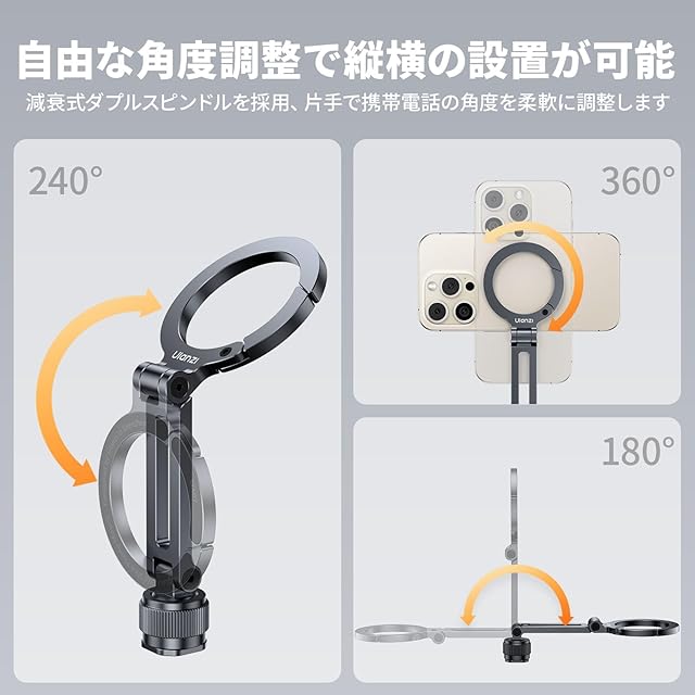 商品名:Ulanzi magsafe用スマホホルダー コールドシュー付き カメラマウント マグセーフリングライトに対応 磁気マグネット式 スマホ三脚ホルダー 1/4インチネジ穴 三脚アダプター 角度調整 折りたたみ式 アルミ製 iPhone用/Android/カメラ/ライトに対応 Maglock MA07