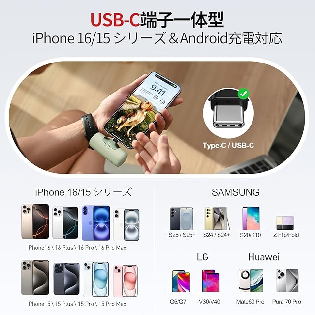 【iPhone 16/15に対応】USB Type-C端子はアンドロイドおよびiPhone 16/15 シリーズの充電に対応しており、急速充電が可能です。低電流モードも搭載されており、イヤホン等の小型電子機器やウェアラブル機器に合った電流で充電することができます。