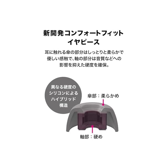 装着しやすく耳から外れにくい本体構造を新開発。イヤホンと耳の接触面を増やすことで耳への負担を抑え、長時間着けたままでも疲れにくい ●新開発コンフォートフィットイヤピース。異なる硬度のシリコンによるハイブリッド構造。耳に触れる部分はしっとりと、音を伝える軸の部分は音質やノイズキャンセリング効果などへの影響を抑えた硬度を確保。