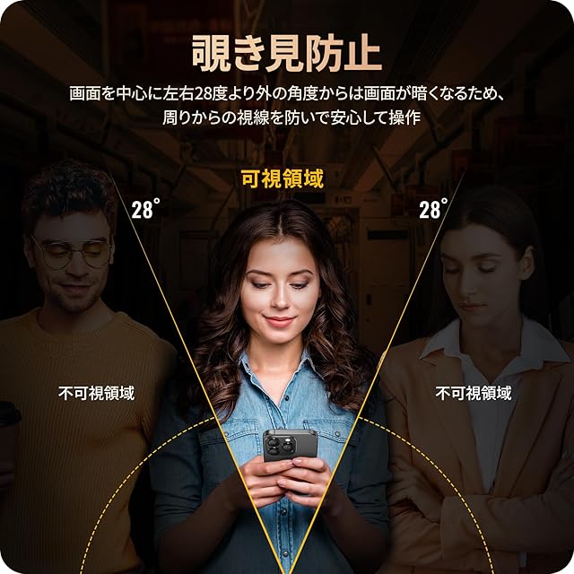 【覗き見防止仕様】覗き見防止技術により、視野角度が左右約28°となり、28°を超えると画面が暗くなり、プライバシーを守ります。例えば、電車やバスの中でメッセージを見ていたら、隣の人に覗かれていたという心配がなく、LINEやメール操作の際も安心です。また、本製品は斜めから見るとブラインドルーバーにより画面が真っ黒になりますが、真正面から見ると高透過率ではっきり見ることが出来ます。