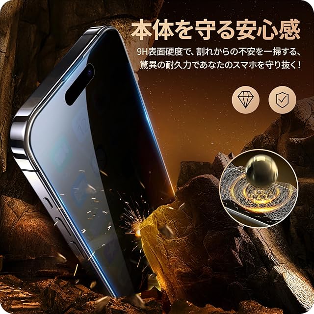 【スマホをしっかり守る】9H硬度ガラスを採用し、ハードコーティング技術により外部からの衝撃を吸収し、画面へのダメージを可能な限り抑えます。飛散防止加工により万一割れてもガラス破片が飛び散りにくいです。